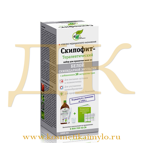 Скипофит-Терапевтический – набор для принятия ванн из белой скипидарной эмульсии с экстрактами трав предназначен для принятия скипидарных ванн из эмульсии скипидарной белой в качестве вспомогательного средства для профилактики или облегчения течения хронических заболеваний за счет улучшения микроциркуляции крови и стимуляции восстановительных процессов в органах и тканях, в том числе и в костной и хрящевой тканях, и как самостоятельное общеукрепляющее средство.